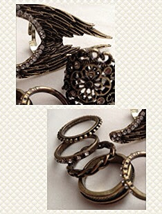 On the one hand we have some statement rings. I love the wings-shaped one for its rhinestone detailing. The one with the ornaments goes very well with the bracelet I mentioned earlier.